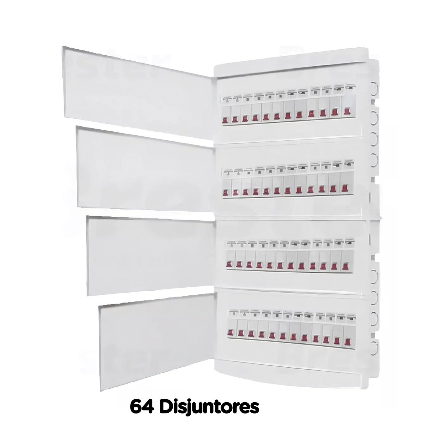 - Capacidade: Suporta até 64 disjuntores modelo DIN, dispostos em linhas horizontais.