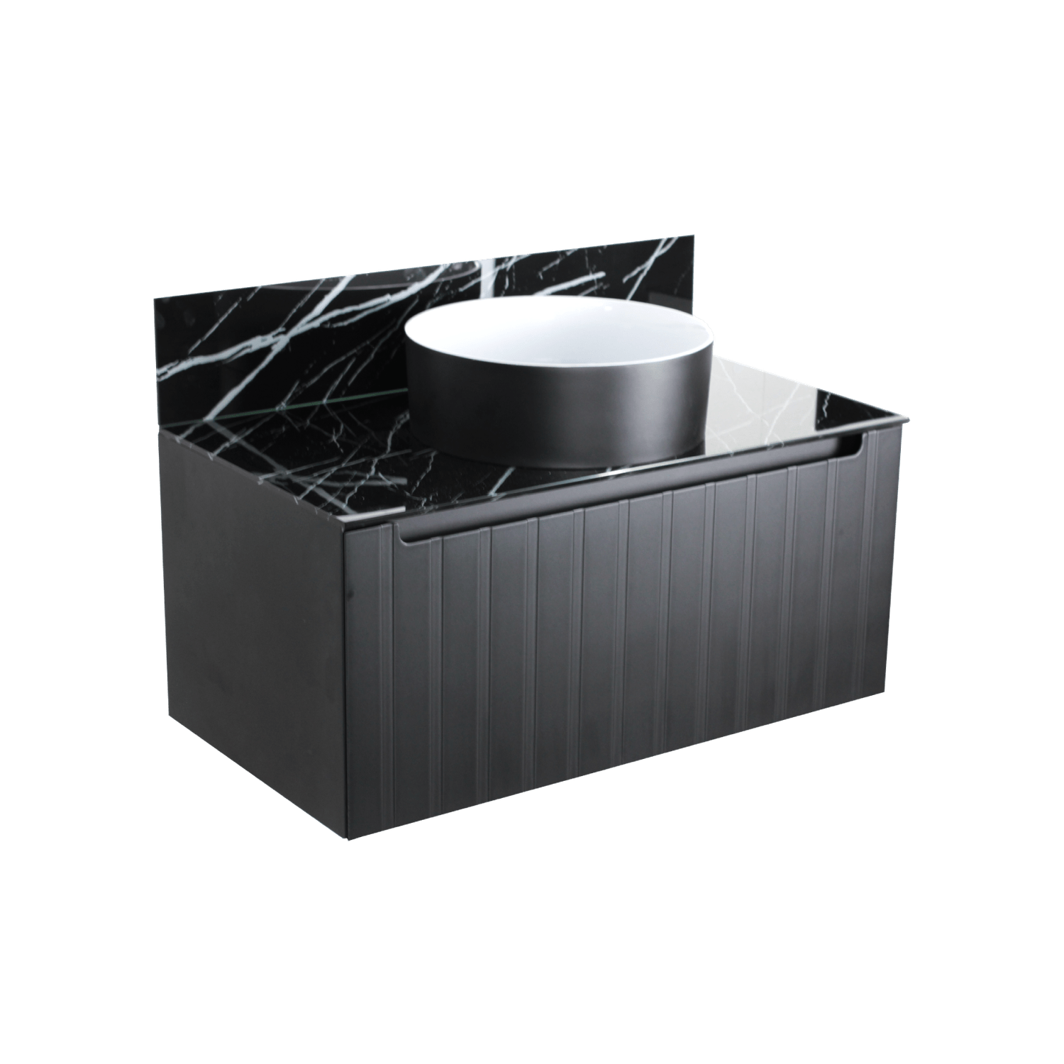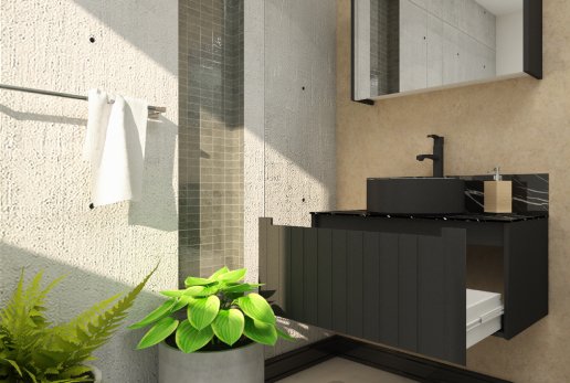 A linha de gabinetes de banheiro Armani é mais um demonstração de como a Mazzu alia qualidade, inovação e cuidado com acabamento de seu produto. O gabinete conta com pintura lacca fosca nas cores preto ou branco com tampo de vidro 8mm temperado com serigrafia exclusiva imitando o mármore Nero Marquina. Para fechar o conjunto, uma cuba redonda de 36cm com acabamento em duas cores e bordas slim. O acabamento externo da cuba também é fosco, como a estrutura do gabinete. O Conjunto acompanha gabinete, espelheira e cuba.