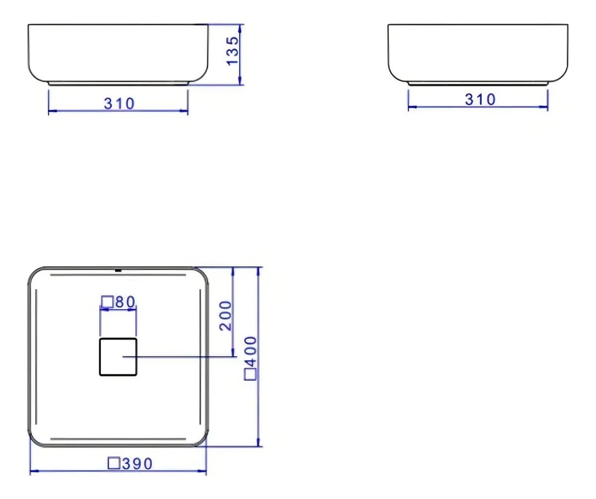Dimensões: 400 mm (largura) x 400 mm (comprimento) x 135 mm (altura)