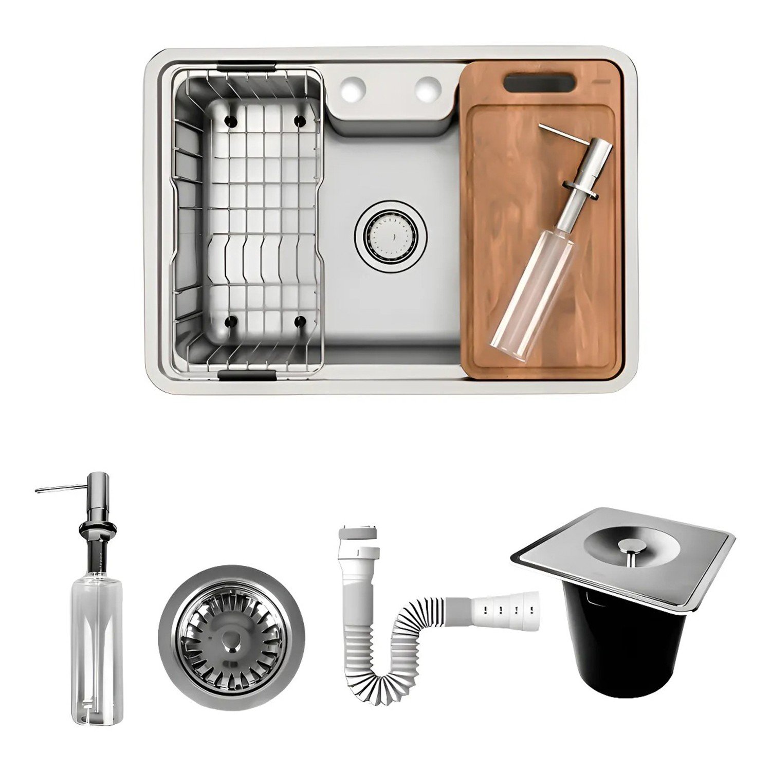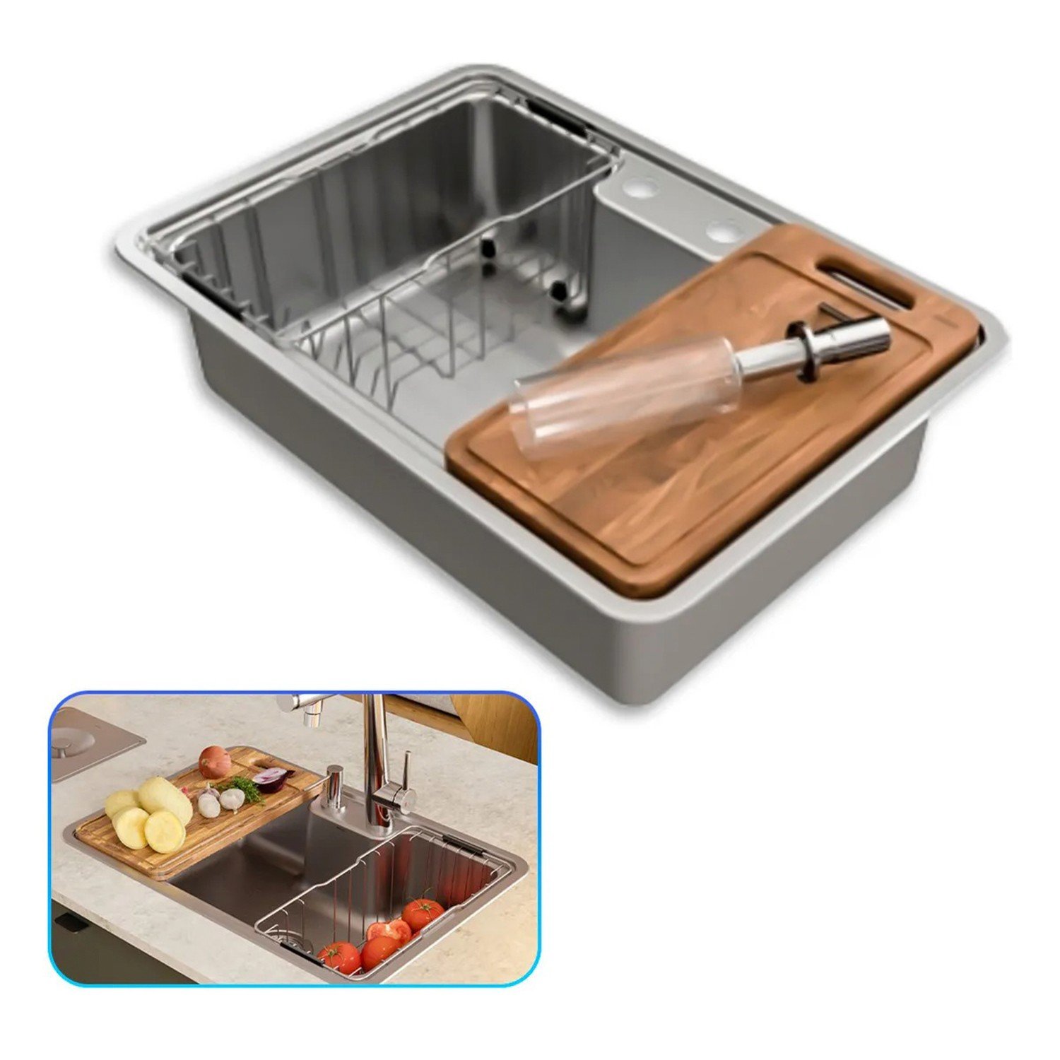 Acessórios Inclusos: Acompanha cesto escorredor aramado e tábua de corte em madeira teca que encaixam-se perfeitamente em ambos os lados da cuba, tornando as tarefas diárias mais práticas. Além disso, conta com um dispensador de detergente que despeja a quantidade ideal do produto, resistente a 150 mil ciclos de uso, e uma lixeira embutida para maior conveniência.