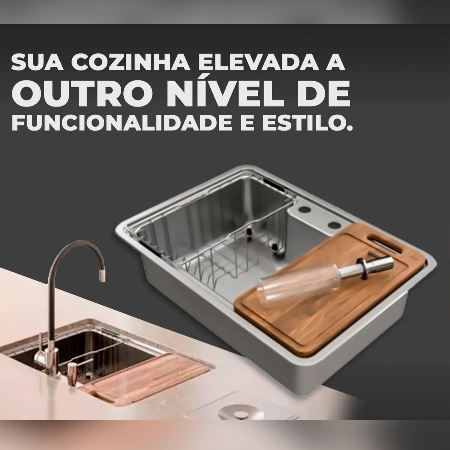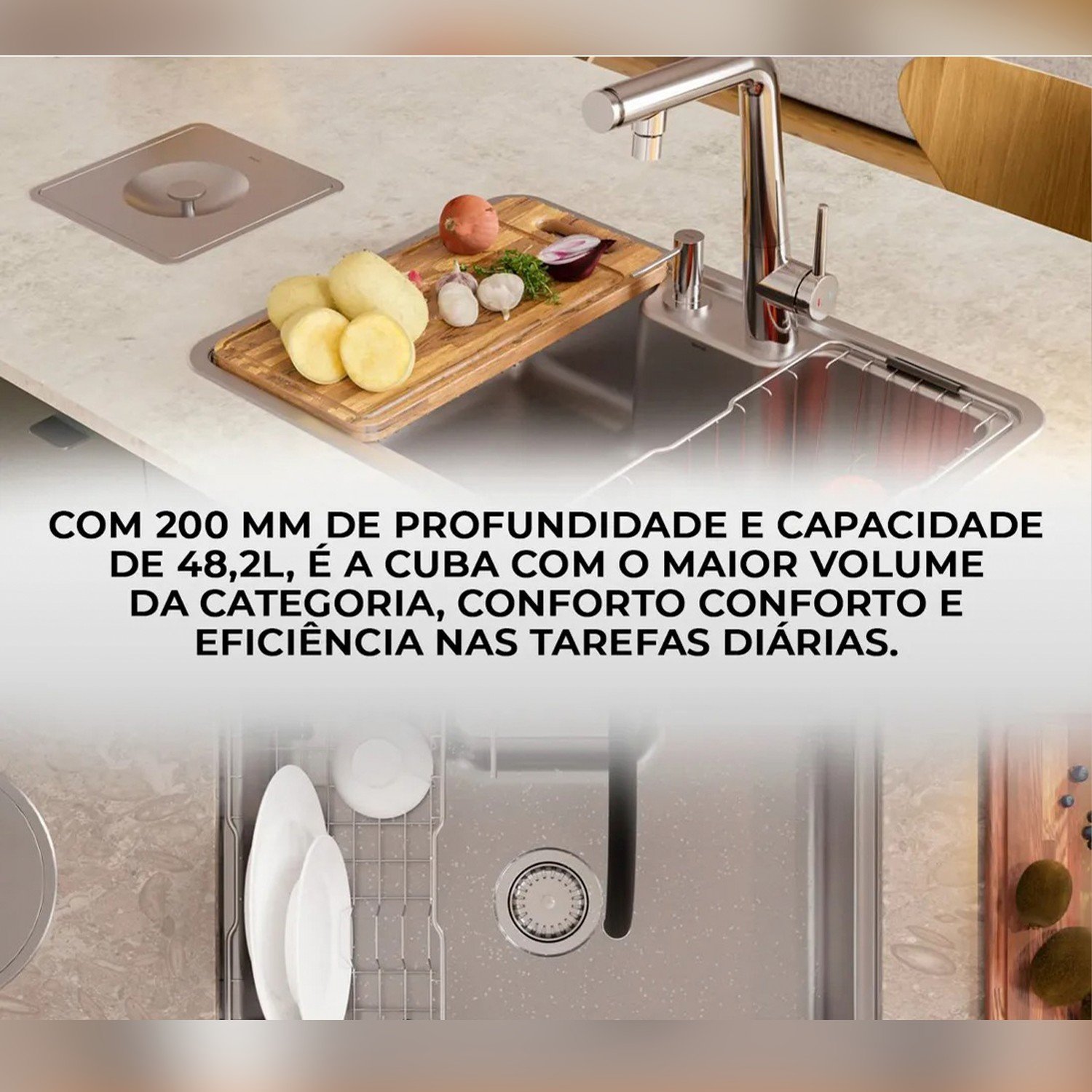 Design Inteligente: A cuba oferece uma excelente área útil, permitindo a instalação tanto embutida quanto sobreposta. Seu formato retangular é ideal para acomodar facilmente um misturador monocomando e um dispensador de detergente.