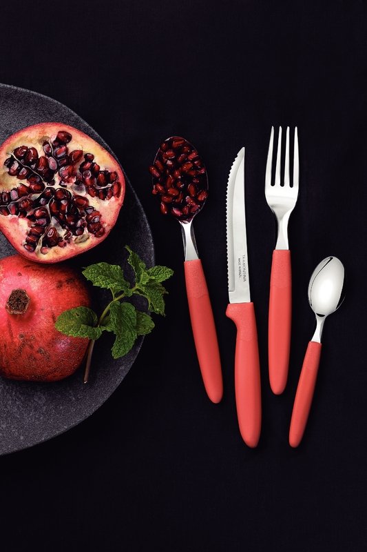 Deixe suas refeições ainda mais convidativas e alegres com o Faqueiro Tramontina Ipanema com Lâminas em Aço Inox e Cabos de Polipropileno Goiaba com Pote Plástico 24 Peças!