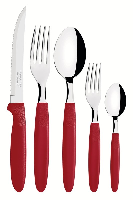 Os talheres têm lâminas produzidas em aço inox que oferecem maior durabilidade devido ao tratamento térmico, e ainda, cabos em polipropileno na estilosa cor vermelha, proporcionando um manuseio super leve e confortável, além de deixar sua mesa muito mais bonita.
