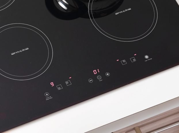 Com controle touch screen (sensível ao toque), mesa vitrocerâmica, quatro queimadores, trava de segurança e 9 níveis de potência. Possui ainda sistema indicador de superfície quente e sensor de panela.