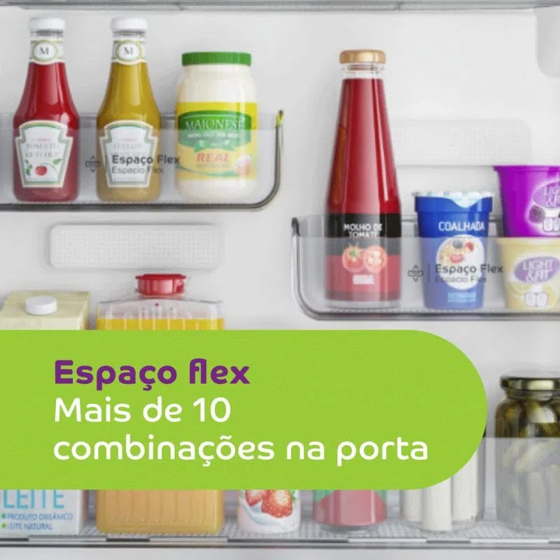 - Espaço Flex: permite ajustar os compartimentos da porta conforme a necessidade, facilitando o armazenamento de garrafas, potes e outros itens.