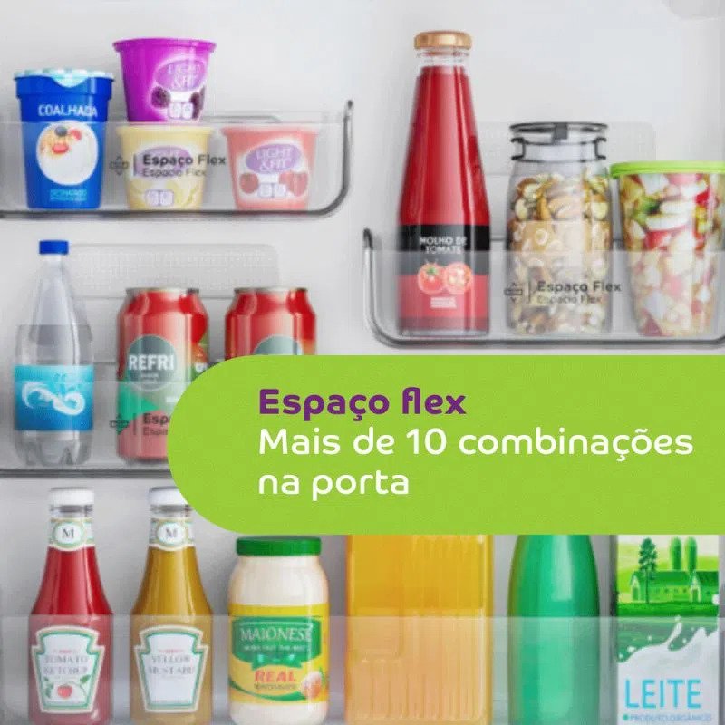 - Espaço Flex: Organize os compartimentos da porta do jeito que preferir, com prateleiras que se encaixam em diversas posições. A Prateleira Flex no freezer permite três configurações diferentes, maximizando o espaço útil e facilitando a organização de itens de todos os tamanhos.