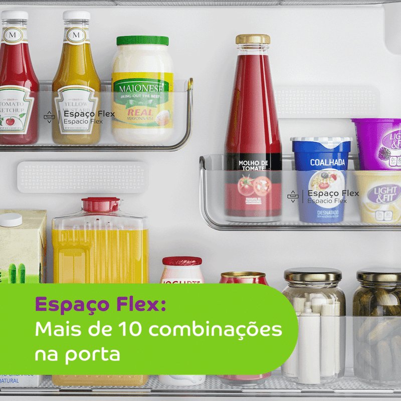 O Espaço Flex permite que você personalize a organização dos compartimentos da porta do jeito que preferir, tornando o armazenamento mais flexível e acessível. Não há mais necessidade de fazer malabarismos para guardar alimentos, pois este modelo é projetado para otimizar o espaço. O compartimento Gelo Extra no freezer proporciona ainda mais praticidade, permitindo armazenar até duas vezes mais gelo para suas festas e bebidas.