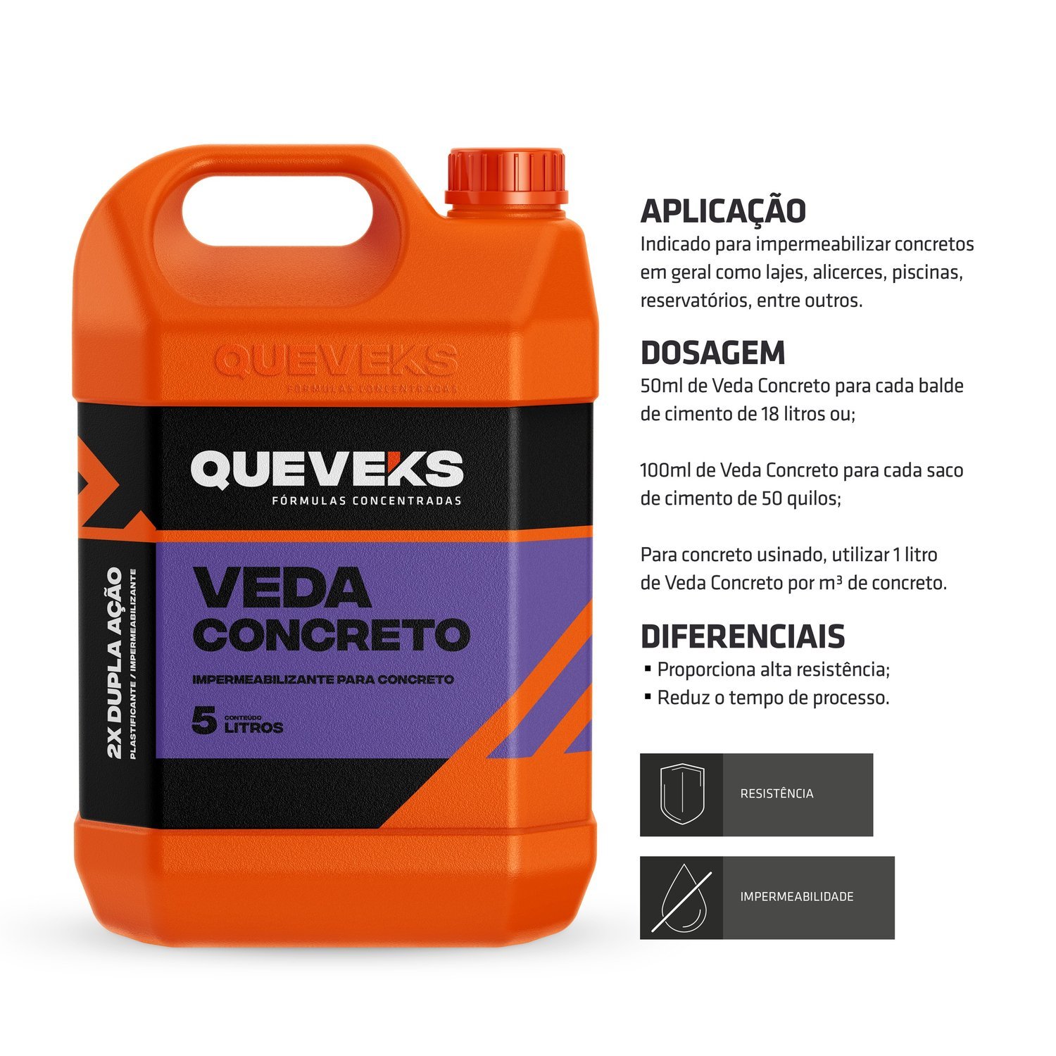 Veda Concreto Queveks é a solução ideal para quem busca resistência, qualidade e economia em obras de construção. Este produto 2 em 1 atua como impermeabilizante e redutor de fator água/cimento, proporcionando concreto mais forte e durável. Ele é indicado para lajes, alicerces, piscinas, reservatórios e outros tipos de obras que exigem impermeabilidade e alta resistência.