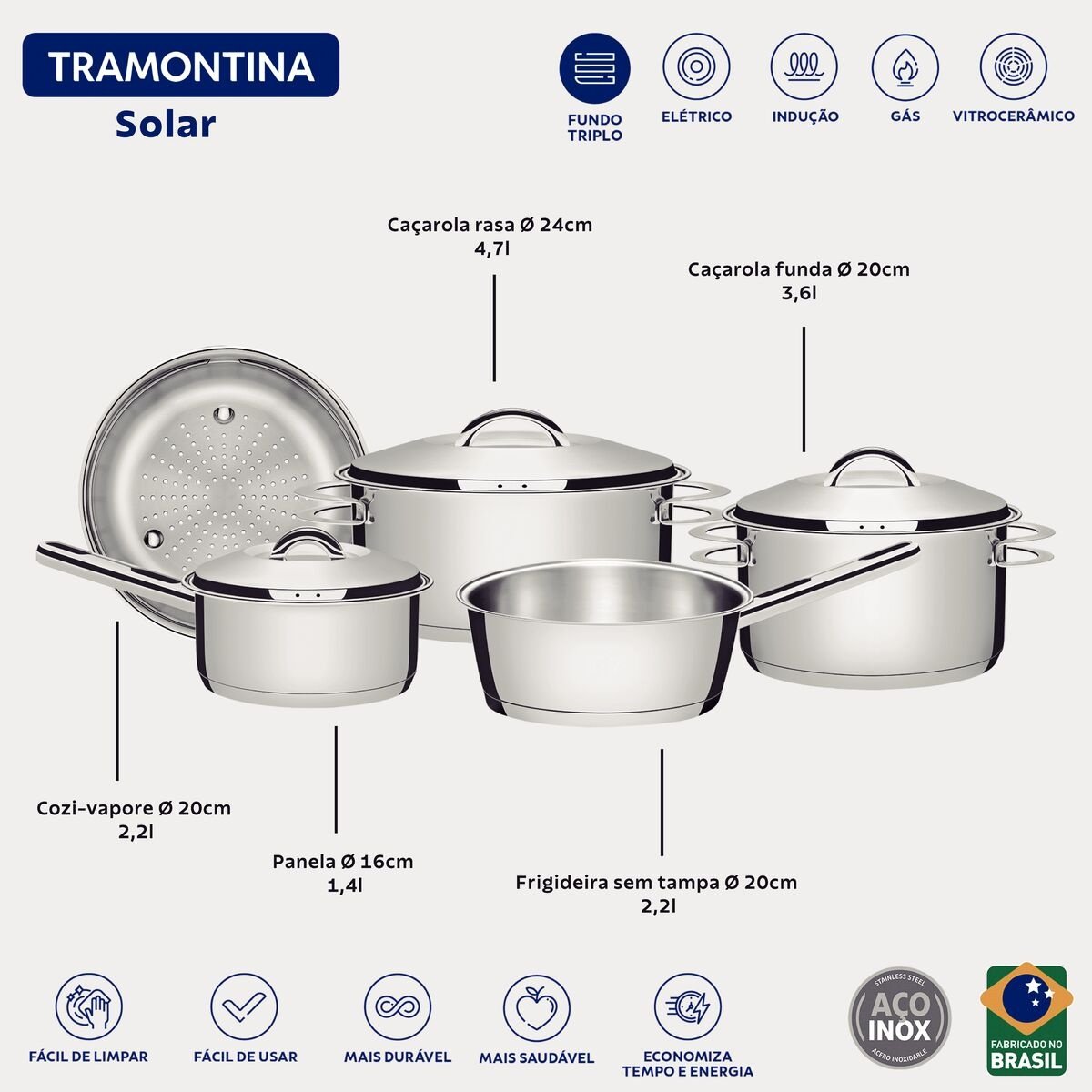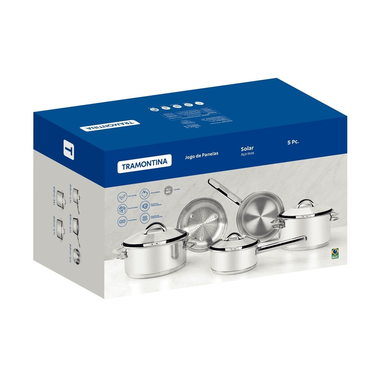 Jogo de Panelas Tramontina Solar em Aço Inox com Fundo Triplo e Tampas de Inox 5 Peças