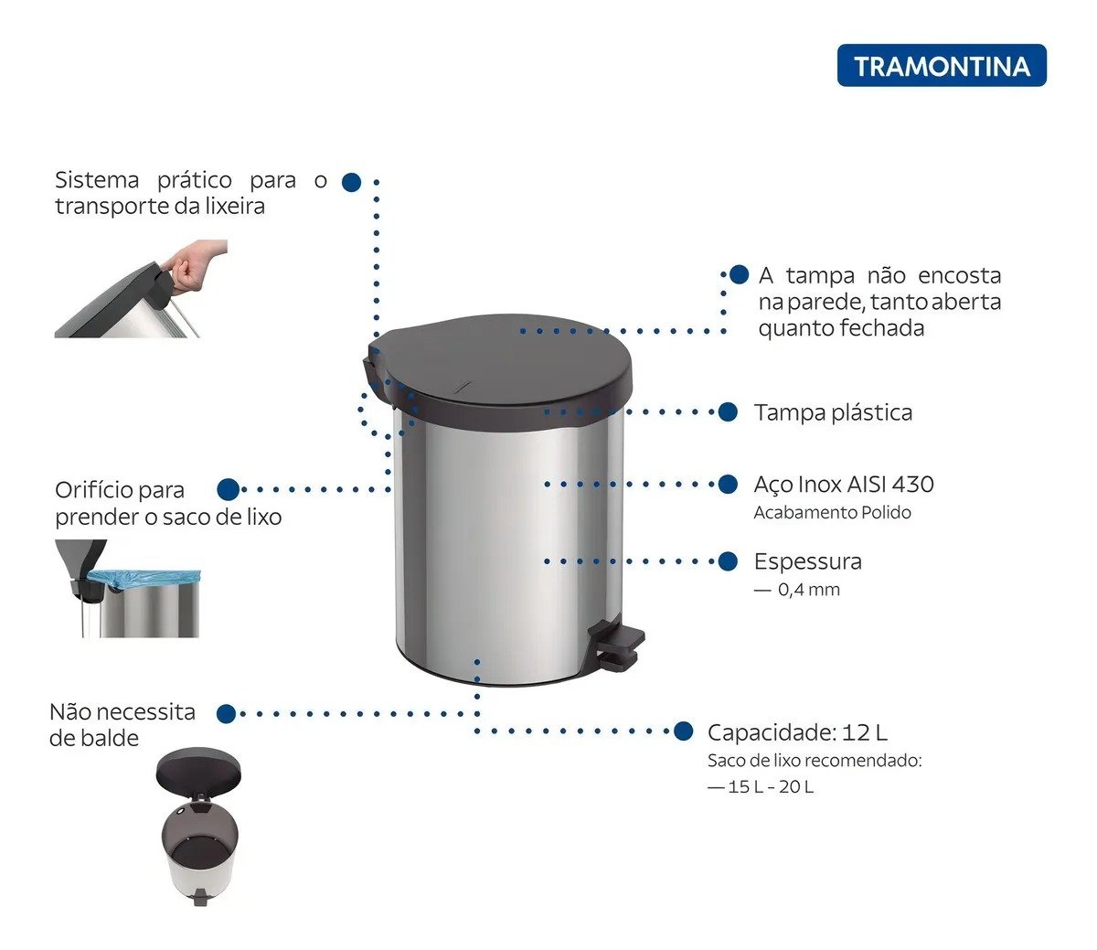Lixeira 12 Litros Inox C/pedal New Tramontina 94538712