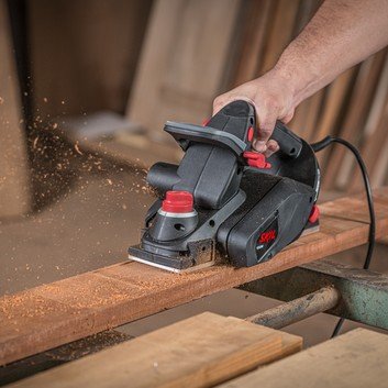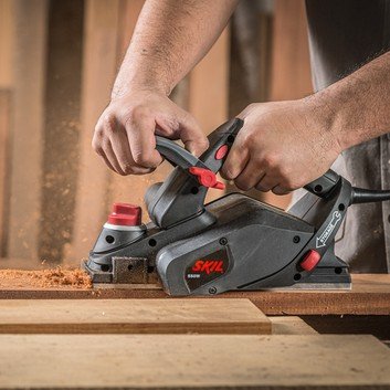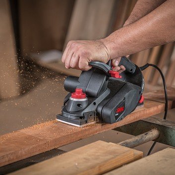 Com 550 Watts de Potência, oferece facilidade para aplainar as superficies de madeira e derivados sem esforço, pois possui duas facas para remoção de material, o acabamento é perfeito pois conta com base em alumínio e mecanismo de ajuste de profundidade de corte de até 1,5 milimetros, para garantir ainda mais o serviço ela dispõe de pé de apoio na parte traseira da ferramenta para não danificar as facas e a superficie trabalhada, sua empunhadeira auxiliar é emborrachada e ajustável para maior conforte ao usuario