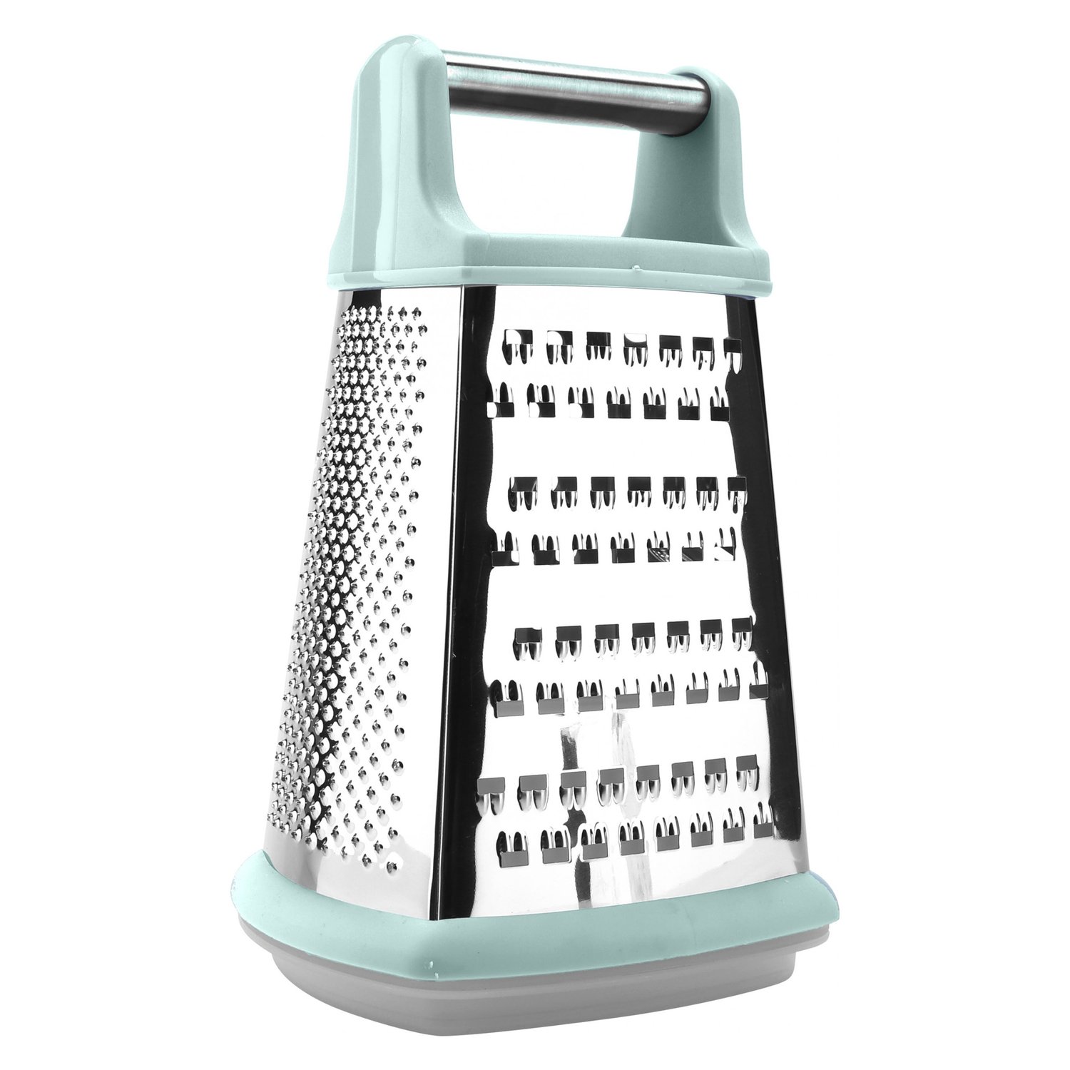 O ralador Oxford em aço inox possui quatro faces com funcionalidades diferentes. Uma delas, inclusive, rala nos dois sentidos. Além disso, tem um pote com tampa na parte de baixo, que se encaixa para receber o alimento já ralado e que também pode ser usado para armazená-los.